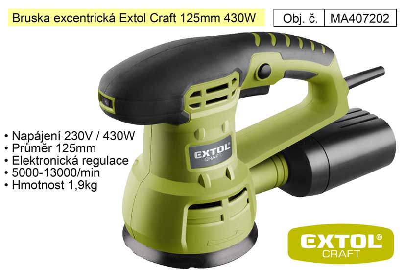 EXTOL CRAFT 407202 bruska excentrická, 125mm, 430W Excentrická bruska je vhodná k suchému broušení dřeva (např. obložení, nábytku, dveří, oken), kovu, umělé hmoty, tmelu, dále k obrušování nátěrů, koroze atd. a k leštění zasucha. Použití suchého zipu…