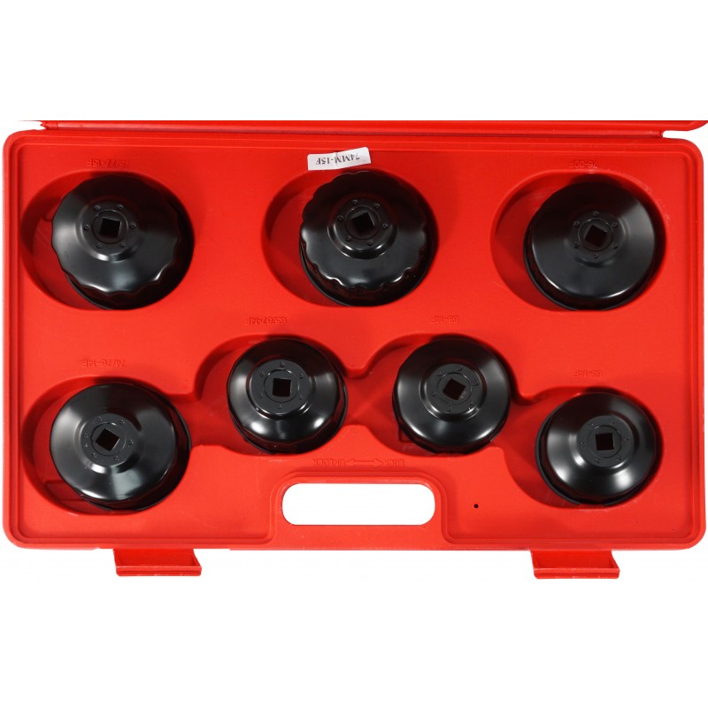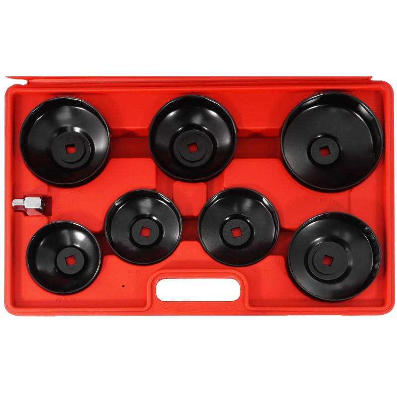 Sada obsahuje: klíče – 65 mm – 14 hran, 65-67 mm – 14 hran, 68 mm – 14 hran, 73 mm – 14 hran, 74-76 mm – 14 hran, 74-76 mm – 15 hran, 80 mm – 15 hran, 93 mm – 15 hran, 100 mm – 15 hran, 80 mm – 15 hran, 82 mm – 15 hran, 75-77 mm – 15 hran, 90 mm – 15 hran, 76 mm – 30 hran, 93 mm – 36 hran, adaptér – redukce 1/2 „- 3/8“ praktický kufr