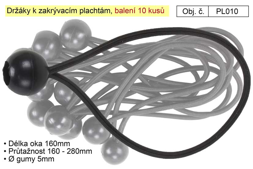 Sada pružných gumových držáků, které slouží k přichycení zakrývacích nepromokavých placet. Smyčku držáku provlékněte kovovým okem plachty. Dále smyčkou provlékněte konec s kuličkou. Vznikne tak pružná zajištěná smyčka, kterou zahákněte například za stanový kolík.