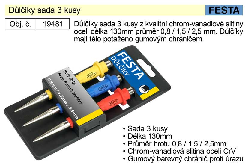 Důlčíky sada 3 kusy z kvalitní chrom-vanadiové slitiny oceli délka 130mm průměr 0,8 / 1,5 / 2,5 mm. Důlčíky mají tělo potaženo gumovým chráničem.