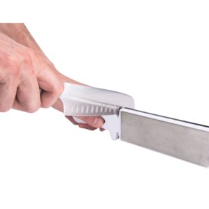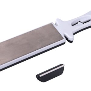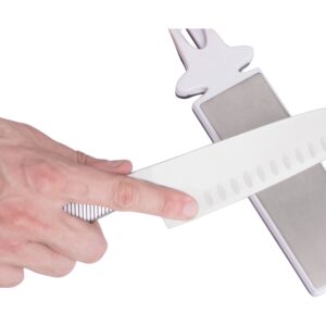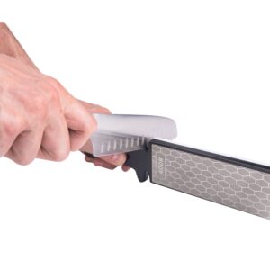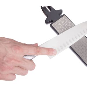 • oboustranný brousek s diamantovým prachem o hrubostech P400/P1000 je doplněn plastovo-keramickým vodičem, který při broušení napomáhá lepšímu udržení konstantního sklonu čepele nože vůči brousku