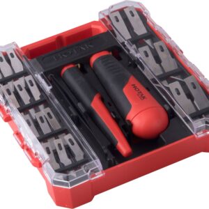 doplňující parametr: sada obsahuje: větší rukojeť a 6ks 9mm širokých břitů, menší rukojeť s 12ks 6mm širokých břitů a pinzetu