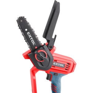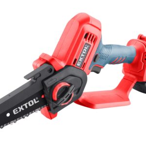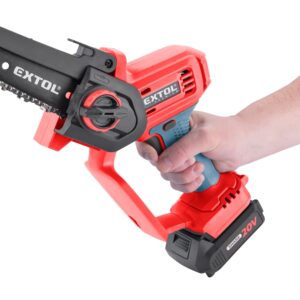 Jednoruční řetězová aku pila je určena k prořezávání stromů a keřů a pro drobné zkracovací řezy dřeva na zahradě, v dílně apod. Aku řetězová pila spojuje výhody elektrických pil – nízký hluk, jednoduchost obsluhy a údržby se svobodou pohybu u benzínových pil. Tato malá aku pila váží jen 1,8kg a je dostatečně robustní na to, aby si snadno poradila s větvemi, ale zároveň dostatečně lehká na to, aby se dala ovládat jednou rukou. Je vybavena kvalitní vodící lištou a pilovým řetězem. Pila má také systém pro snadnou a rychlou výměnu řetězu a mechanismem pro jednoduché vypnutí řetězu. Vysokou bezpečnost zajišťují tři prvky: horní chránič řetězu, chránič rukou, který vás chrání před pořezáním, poškrábáním a škrábanci a spínačem s pojistkou zabraňující náhodnému spuštění. Pogumovaná rukojeť brání vysmeknutí, tlumí vibrace a zpříjemňuje držení při práci. Akumulátor je vybaven ukazatelem nabití, což umožňuje uživateli si rozvrhnout délku práce a dát si včas nabít další akumulátor. Pro běžnou práci dostačují jeden nebo dva 2Ah akumulátory, které můžete rychle nabít v rychlonabíječce, pro náročnější nebo delší práci doporučujeme větší akumulátory s kapacitou 4–8Ah. Akumulátor lze použít ve všech typech nářadí řady EXTOL SHARE20V. Díky použité Li-ion technologii je ho možné kdykoliv dobíjet, aniž by se tím snižovala jeho kapacita. Li-ion akumulátor ztrácí energii vlivem samovybíjení velmi pomalu a vydrží dlouho nabitý a připravený k použití.