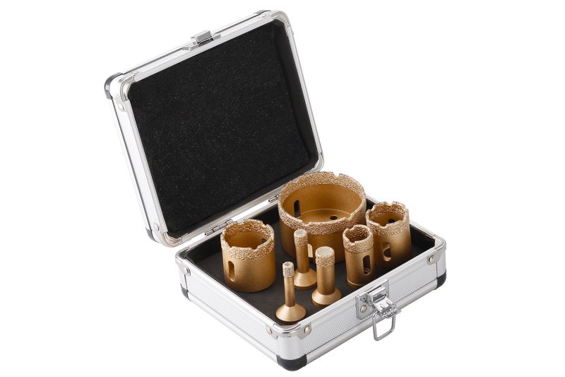 – sada profesionálních vykružovacích diamantových korunek se závitem M14 – pro úhlové brusky v praktickém a odolném hliníkovém kufru