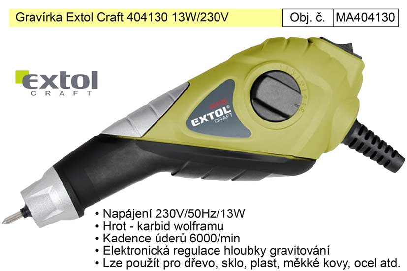 info: kadence úderů 6000/min, gravírovací hrot – karbid wolframu, pro materiály do tvrdosti 58 HRC (dřevo, sklo, plast, měkké kovy, ocel atd.), el. regulace hloubky – ano