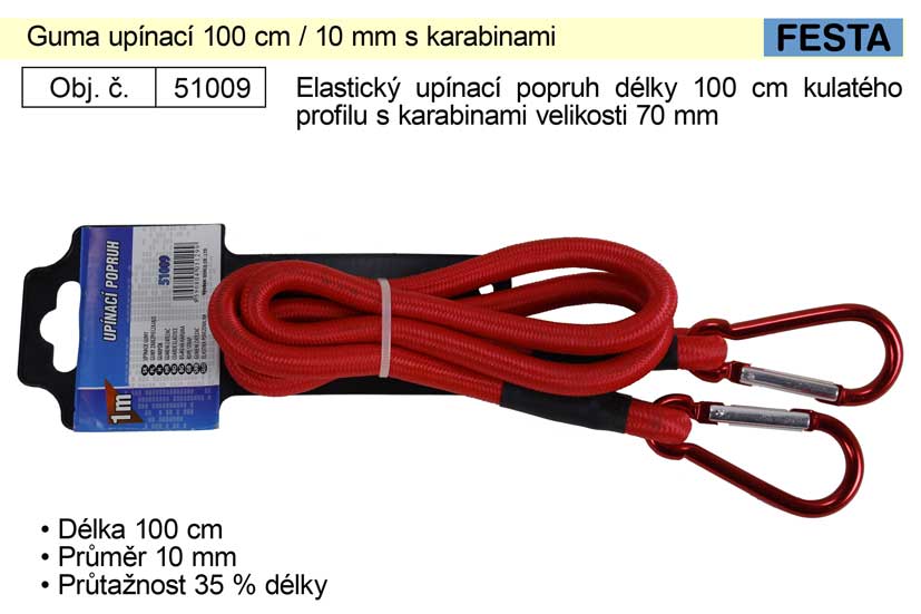 Elastický upínací popruh délky 100 cm kulatého profilu s karabinami velikosti 70 mm