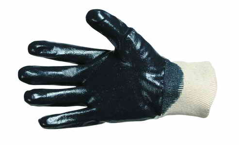 Rukavice šité z bavlněného úpletu, polomáčené v nitrilu, s pružným nápletem.