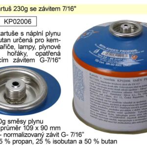 doplňující parametr: pro plynové kartuše s propan-butanovou náplní splňující normu EN417 s EU závitem 7/16″, výkon 1,7kWh, spotřeba 123g/h