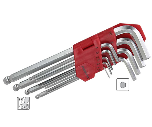 Sada obsahuje 9 kusů metrických klíčů Imbus,s kuličkou, vyrobených z kvalitní chromvanadiové slitiny oceli.