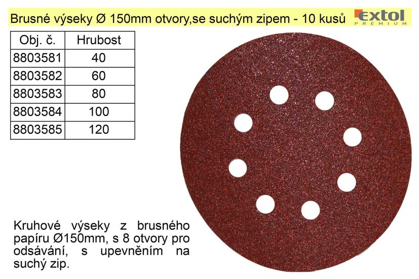 Kulaté výseky KONNER s 8 otvory by neměla chybět ve vaší dílně. Používá se k broušení dřeva, plastů a kovů. Její průměr je 150 mm. Je vyrobena z Aluoxidu. Je vhodný pro excentrickou brusku. Má zapínání na suchý zip a balení obsahuje 10 kusů.