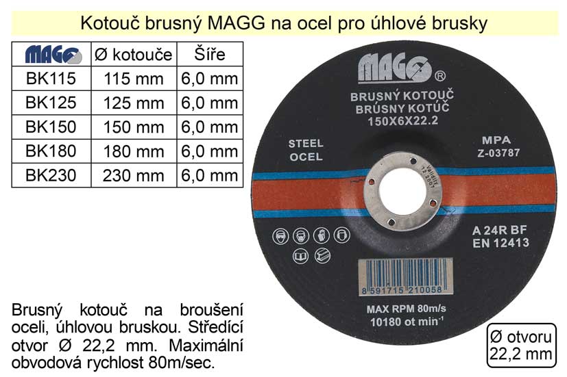 Brusný kotouč na broušení oceli, úhlovou bruskou. Středící otvor průměr 22,2 mm. Maximální obvodová rychlost 80m/sec.