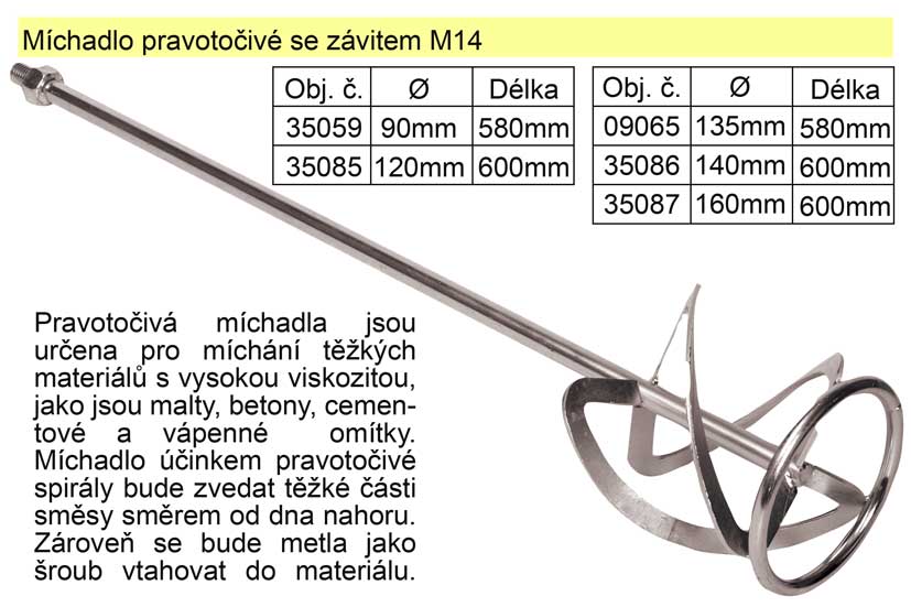 Pravotočivá míchadla jsou určena pro míchání těžkých materiálů s vysokou viskozitou, jako jsou malty, betony, cementové a vápenné omítky. Míchadlo účinkem pravotočivé spirály bude zvedat těžké části směsy směrem od dna nahoru. Zároveň se bude metla jako šroub vtahovat do materiálu.
