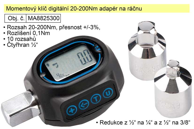 doplňující parametr: s redukcí na čtyřhran 1/4″ a 3/8″, přesnost ±3,0%, rozlišení 0,1Nm, možnost výběru jednotek: N-m, kg-cm, kg-m, in-lb, ft-lb