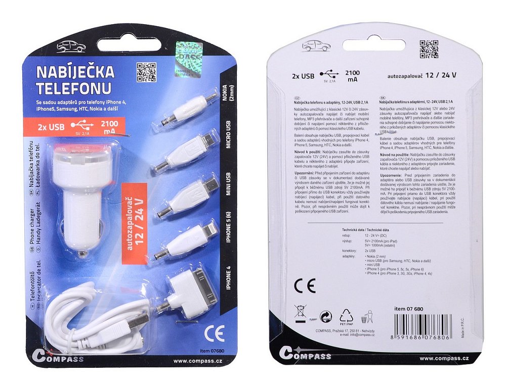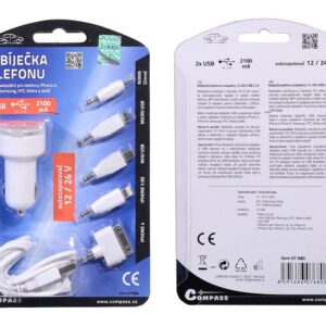 Nabíječka umožňující z klasické 12V či 24V zásuvky autozapalovače napájet či nabíjet mobilní telefony, MP3 přehrávače a další zařízení schopné dobíjení či napájení pomocí některého z přiložených adaptérů či pomocí klasického USB kabelu.