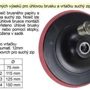 Kruhový nosič brusného papíru s povrchem pro upevnění brusiva na suchý zip. Nosič lze aplikovat v úhlové brusce montáží přímo na vřeteno úhlové brusky (závit M14), nebo pomocí stopky, která je přiložena v sadě – do vrtačky.