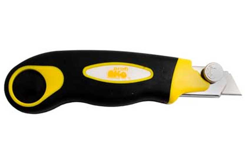 Nůž s plastovým tělem, žiletkového typu, ulamovací, s aretací vysunutí břitu a kovovou výztuhou a pogumovanou rukojetí , pro lepší držení a zásobníkem náhradních čepelí.