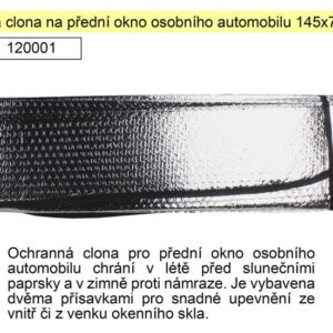 Ochranná clona pro přední okno osobního automobilu chrání v létě před slunečními paprsky a v zimně proti námraze. Je vybavena dvěma přísavkami pro snadné upevnění ze vnitř či z venku okenního skla.