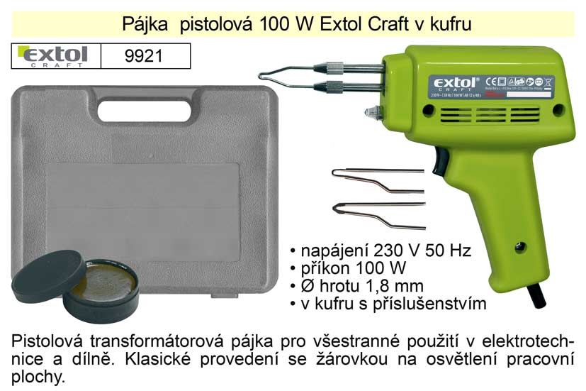 EXTOL CRAFT 9921 pistole pájecí transformátorová, 100W Snadná obsluha, model 9921 v kufříku s příslušenstvím….
