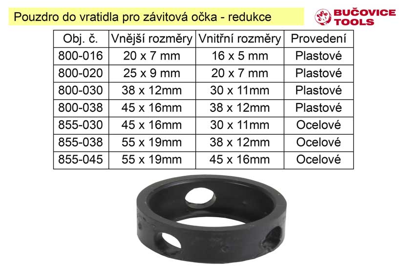 Plastové pouzdro – redukce do vratidla závitového očka. Po vložení do vratidla umožní použít větší vratidlo pro očko menších rozměrů.