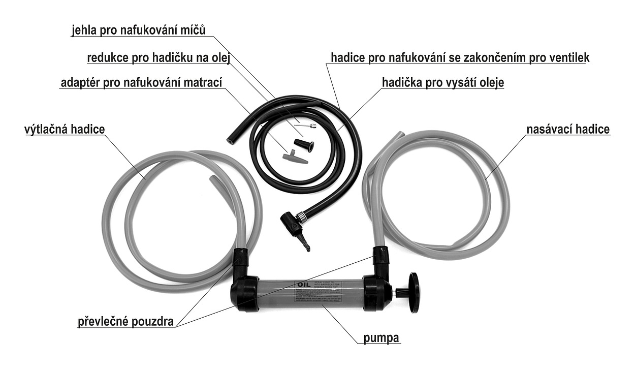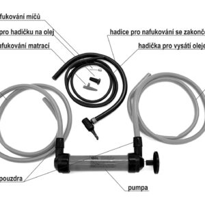 Balení obsahuje multifunkční pumpu, 2x nasávací / hustící hadici, hadičku pro odsávání motorového oleje, hadičku pro huštění kol a adaptéry.