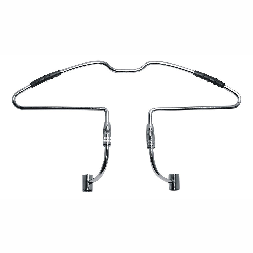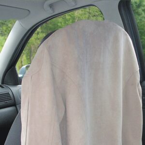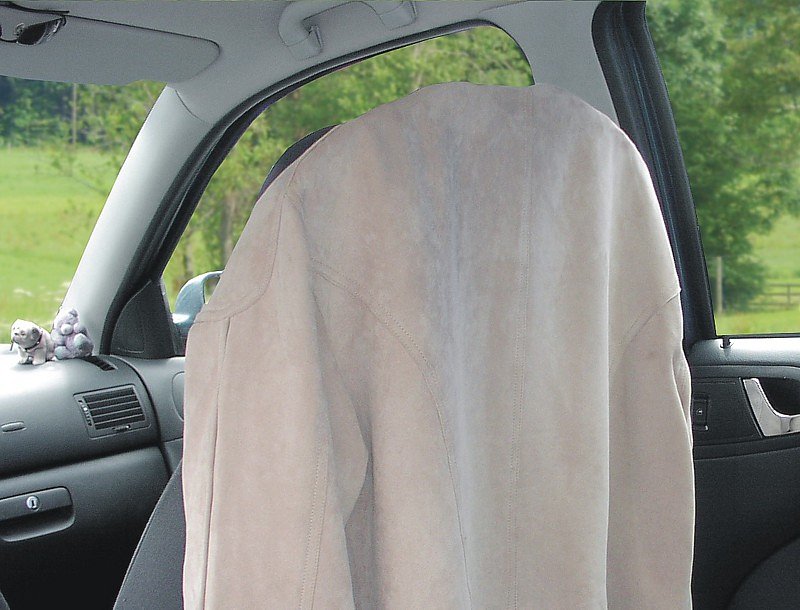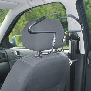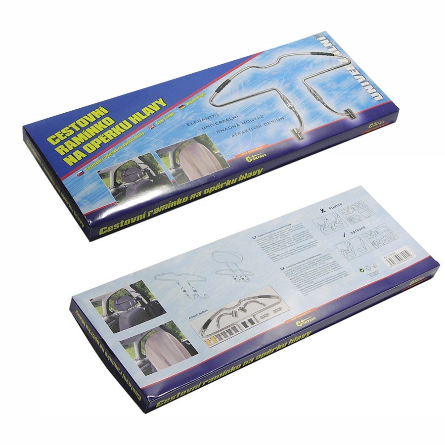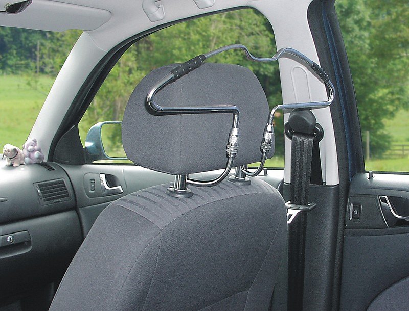 Univerzální kovové ramínko na oděvy, určené k připevnění na zadní stranu opěrky hlavy předního sedadla automobilu. Přiloženo 5×2 vymezovacích adaptérů pro různé průměry držáků opěrky hlavy (8, 10, 12, 12.7, 14.1 a 16 mm). Barva chrom.