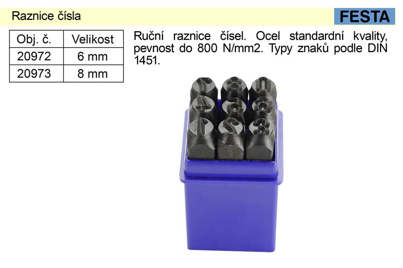 Ruční raznice čísel, výška 6,0 mm. Ocel standardní kvality, pevnost do 800 N/mm2. Typy znaků podle DIN 1451.