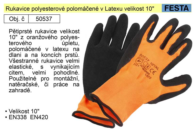 Pětiprsté rukavice velikost 10″ z oranžového polyesterového úpletu, polomáčené v latexu na dlani a na koncích prstů. Všestranné rukavice velmi elastické, s vynikajícím citem, velmi pohodlné. Použitelné pro montážní, natěračské, či práce na zahradě.