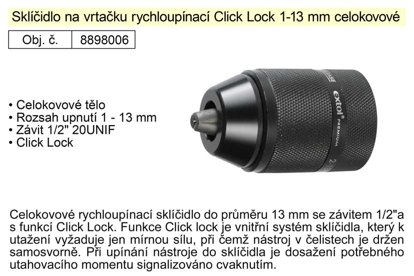 Sklíčidlo na vrtačku rychloupínací Click Lock 1-13 mm celokovové