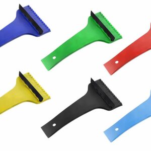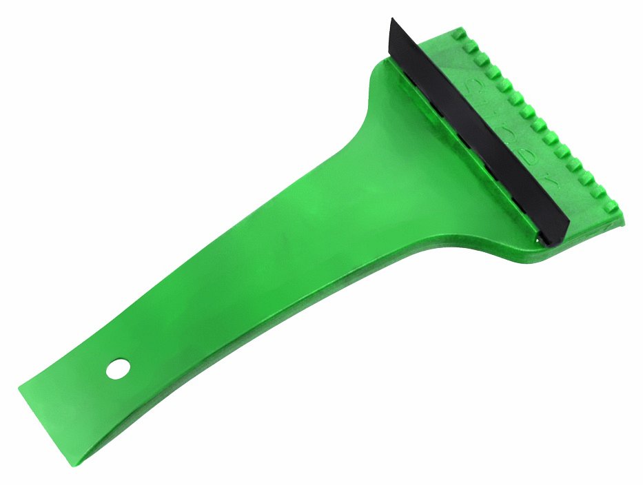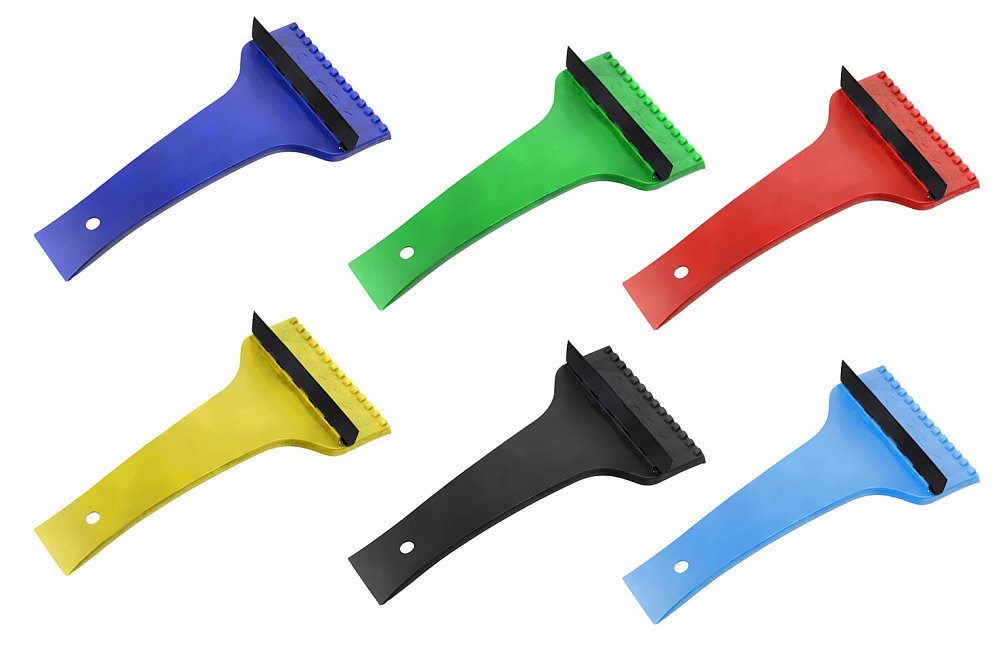 Plastová škrabka na sníh nebo led klasické konstrukce, vybavená gumovým břitem.