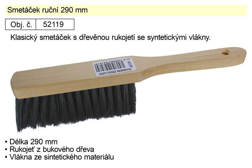 Klasický smetáček s dřevěnou rukojetí se syntetickými vlákny.