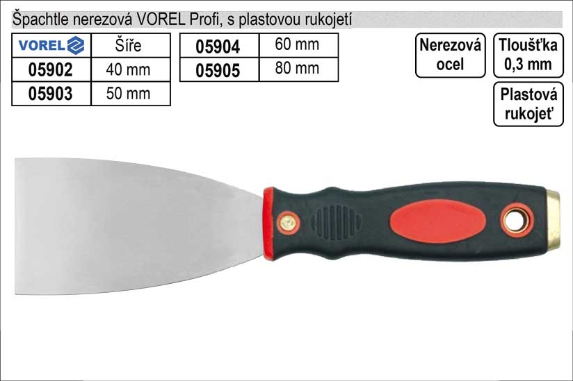 Špachtle (50 mm) z nerezové leštěné oceli s ergonomickou rukojetí a úderníkem, pokrytou dvěmi vrstvami barevného plastu různé tvrdosti zajíšťující pevný úchop.