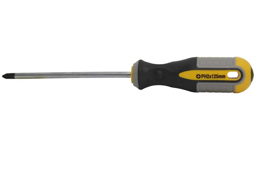 Křížový šroubovák, s pogumovanou rukojetí, s dříkem z chromvanadiové oceli.