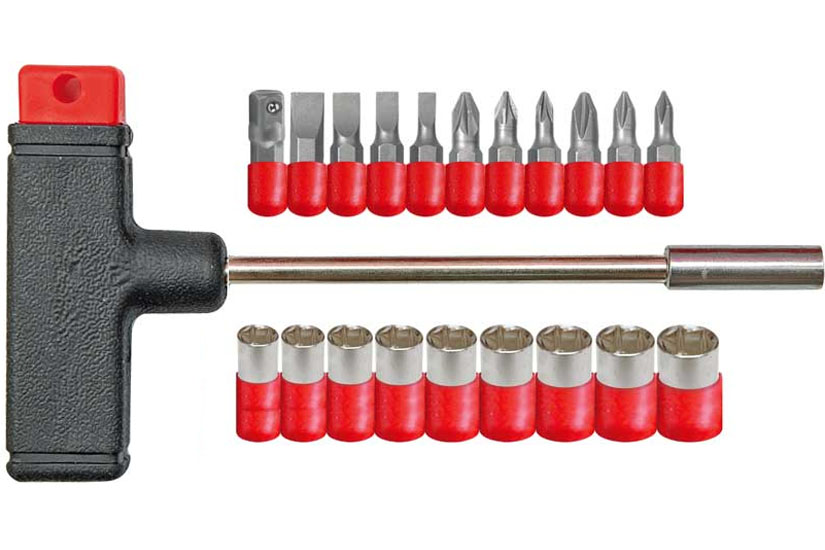 Šroubovák ve tvaru T v sadě nástrčnými klíči a bity. Díky speciálně tvarované rukojeti ve tvaru T vám nebude šroubovák prokluzovat v dlani, na rozdíl od běžných šroubováků, ani při větším záběru.