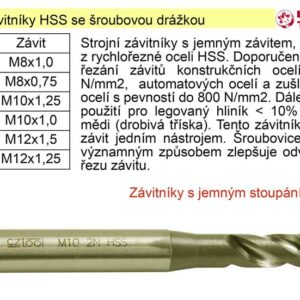 Strojní závitník s jemným závitem, válcovaný z rychlořezné oceli HSS. Doporučené použití k řezání závitů konstrukčních ocelí do 500 N/mm2, automatových ocelí a zušlechtěných ocelí s pevností do 800 N/mm2. Dále je možno použití pro legovaný hliník < 10% Si; slitiny mědi (drobivá tříska). Tento závitník řeže celý závit jedním nástrojem. Šroubovice závitníku významným způsobem zlepšuje odvod pilin z řezu závitu. Výrobek je vyroben předním Českým výrobcem Bučovice Tools.