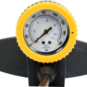 Ruční hustilka s manometrem, vyrobená z odolného plastu, má pevnou základnu pro snadnou manipulaci. Je vybavena 60 cm dlouhou hadicí zakončenou univerzálním hrotem pro nafukování jízdních kol i pro auta.