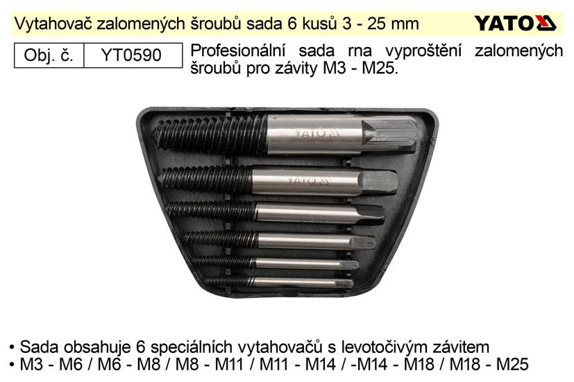 Sada obsahuje 6 kusů vytahovačů s levotočivým závitem M3 – M25.