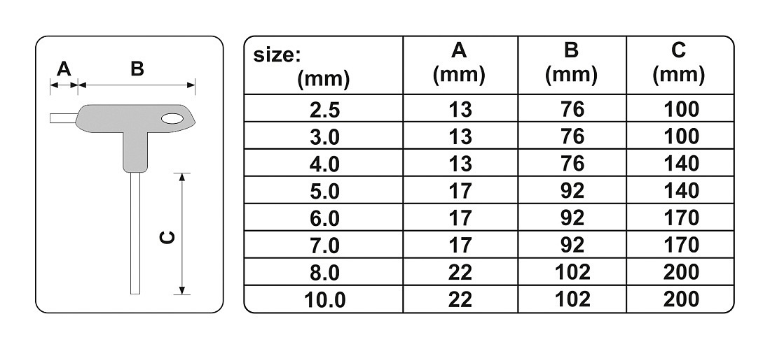 Sada klíčů v provedení T šroubovák, osazený 2x imbus klíčem (1x dlouhý, 1x krátký) a ergonomickou rukojetí, díky které je jeho použití opravdu snadné. Vyrobeno z oceli S2, která zaručuje dlouhou životnost.