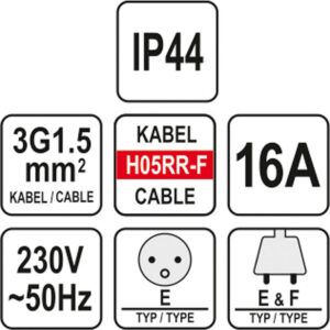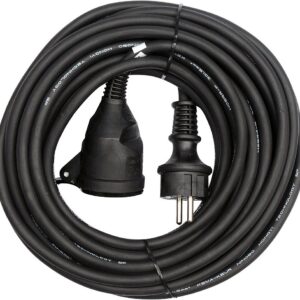 Vysoce kvalitní 20m izolovaný prodlužovací kabel. Kabel je vyroben ze 3 měděných vodičů o průřezu 1,5 mm2 každý. Takový průřez kabelu umožňuje připojení zařízení často používaných na stavbě, v dílně nebo ve výrobním závodě na tyto prodlužovací šňůry. Kabely jsou pokryty izolací z přírodního kaučuku H05RR-F, která je vysoce odolná proti mechanickému poškození, povětrnostním vlivům a chemickým látkám (chladicí a mazací oleje, benzín nebo etyl a metylalkoholy). Tato izolace poskytuje jmenovité napětí 300V / 500V. Prodlužovačka je navíc vyrobena v souladu s normou IP 44. Díky použití špuntů odolných proti prachu a stříkající vodě umožňuje použití těchto prodlužovaček v interiéru i exteriéru, např. na stavbě, na zahradě , na náměstích před výrobními závody. Díky odolnosti proti stříkající vodě a prachu poskytuje vynikající ochranu proti vlhkosti, prachu a písku Maximální výkon připojeného zařízení: 3680 W