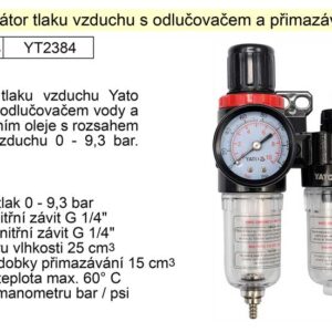 Regulátor tlaku vzduchu Yato YT-2384 s odlučovačem vody a přimazáváním oleje s rozsahem regulace vzduchu 0 – 9,3 bar.