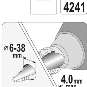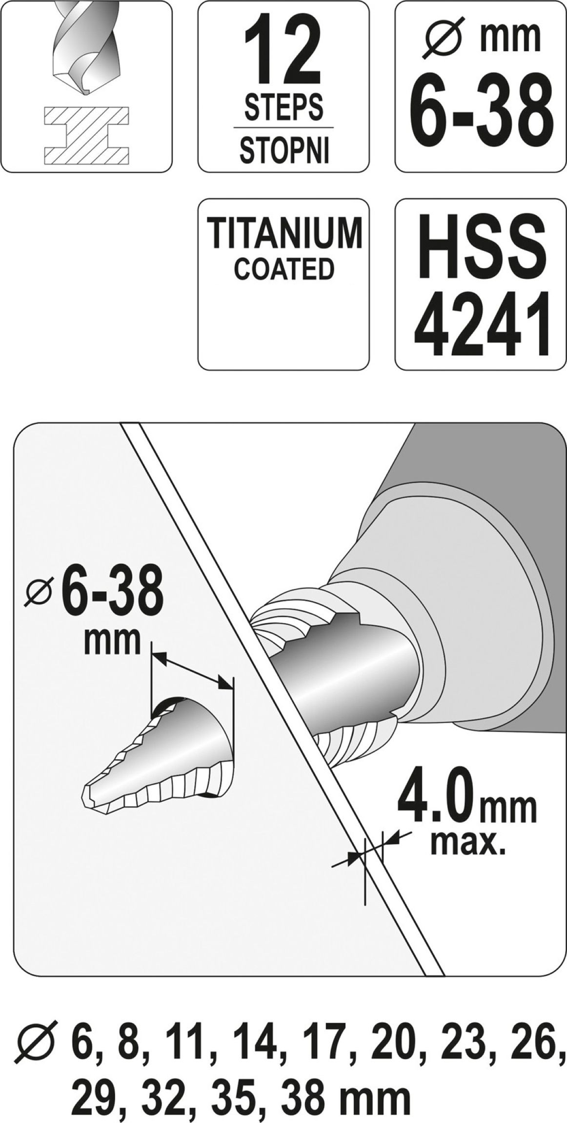 Každý jednotlivý stupeň může vrtat otvor do maximální hloubky 4 mm. Celkově je vrták vybaven 12 stupni o průměrech 6; 8; 11; 14; 17; 20; 23; 24; 29; 32; 35 a 38 mm.